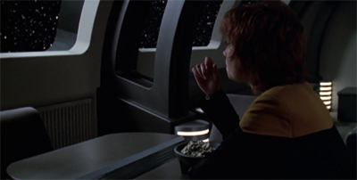 As a result, the episode works hard to distinguish Ballard from the types of supporting characters casually killed off in episodes like Unity or Innocence. “Thank you for saying those nice things about me,” Ballard remarks to Janeway after the staff meeting that welcomes her home. “To be honest, I never thought you noticed me.” Janeway responds. “My mistake.” This emphasis on Ballard’s greatness is distracting. She seems to spend a lot of time with the senior staff, despite being an ensign. Would her death have been any less tragic or more meaningless if she wasn’t great?