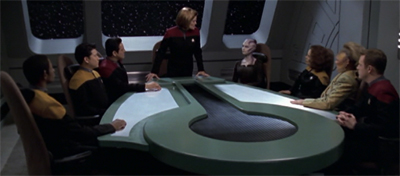 Fuller imagined that the Kobali, from the sixth season episode Ashes to Ashes, would sweep down on the dead crew and reanimate them, which is the way the Kobali procreate. The crew would then have new Kobali lives. Of course, a few crew members, Chakotay, the Doctor, Neelix, and Kim would have been on away missions, and then would have to either rescue the rest of the crew or decide to leave them in their new lives. The idea was not used in that form. Laughed Fuller about the idea of killing off most of the crew, “We were told that it was tasteless to do that.”