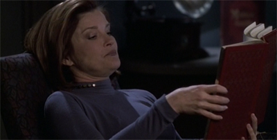 I note that Janeway is reading classic hardcover tomes in low light wearing her purple undershirt. It’s a highly Jean Luc moment. I am surprised she wasn’t listening quietly to Mozart or Beethoven as well. We can see the allusions to TNG here.