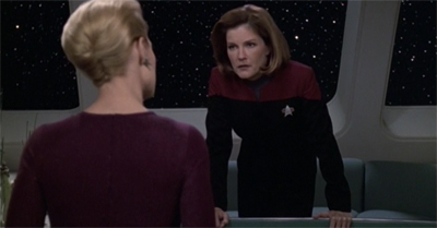 A psychoanalytic critic would probably make a pretty good case for Voyager as the pre-oedipal Star Trek. And if Voyager is the pre-oedipal Trek, then The Next Generation is definitely the post-oedipal. Unlike TNG, which favours relationships among fathers, sons, and brothers – biological, spiritual, or technological, and almost always oedipal in their dynamics – Voyager prefers explorations of relationships based on the mother-daughter model.