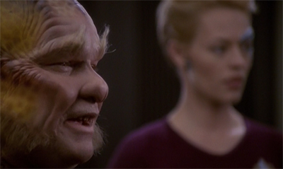 Aside from this minor issue there is a lot I liked about this episode which I had almost forgotten. In fact, I found it very moving, well written and well paced. The acting especially by Jeri Ryan is superb in my opinion. At times without speaking words her face speaks volume. I liked the interwovenness of her trauma with her new role as a foster mother, as well as the implication that the Brunali’s clinging to their home is comparable to the desperate attempt by Voyager to get home (of course not quite as desperate as the Equinox’ attempt). It was nice to see a legitimate questioning of “home” and parentship just because of biological relationship.