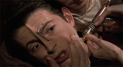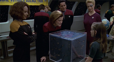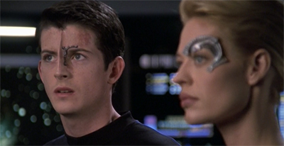 That was maybe my favorite episode of the year. It turned out to be an episode about the Elian Gonzalez case, this Cuban kid who is in America. Does he go back to Cuba where he doesn’t have all of the creature comforts and all of the opportunities that America affords him? Once we got these Borg kids on the ship, we started developing this relationship that Seven has with these kids. The idea that she had bonded maternally with them created an opportunity to explore another aspect of her character and her humanity, her sense of protectiveness over these kids, and her attitude that this kid was much better off staying with her than going back with his parents. It allowed us to dig into and explore some of those issues about what’s really important for a kid’s development. Is it just parental love, or is it more than that?