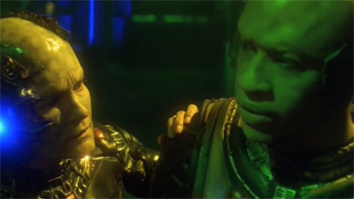 Unfortunately, Unimatrix Zero, Part I and Unimatrix Zero, Part II never quite captures the scale of this would-be revolution. “There are things I can do where I am,” Axum tells Seven at one point in Unimatrix Zero, Part II. “I’ll try to contact Species 8472, see if I can persuade them to join the fight.” Seven responds, “Given their history with the Borg, I’m sure they’ll be eager.” However, there’s never a sense that the conflict in Unimatrix Zero, Part I and Unimatrix Zero, Part II is anything more than characters talking on sets; the Borg Queen in her throne room, Korok on a Borg Sphere, the drones in Unimatrix Zero.