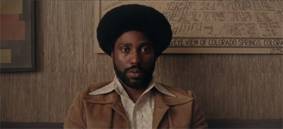 The investigation at the centre of the film is driven by Ron Stallworth, a character whose enthusiasm and zeal sustains the movie across its runtime, conveyed through the easy charm of John David Washington. On the surface, Stallworth is drawn relatively broadly, introduced toying with his impressive afro and prone to practice kung-fu with his own sound effects when nobody is watching. There is a sense that Stallworth is energetic and simply looking for a direction in which he might channel that energy; he wants to work a case, and the KKK almost present themselves to him.