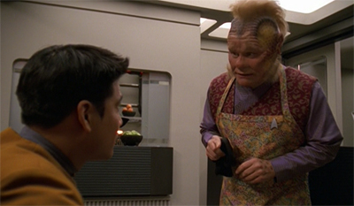 Still, this lack of movement is one measure of the show’s lack of interest in Harry Kim. After all, Voyager is a show that is very enthusiastically and uncritically invested in the idea of Starfleet as an ideal. The Maquis crewmembers were all in Starfleet uniforms by the end of Caretaker. Episodes like Prime Factors and State of Flux made it clear that Voyager would be a ship that adhered to Starfleet principles, just as faithfully as Voyager adhered to the familiar Star Trek template. Starfleet matters to Voyager. The ranks of these fictional characters matter to Voyager.