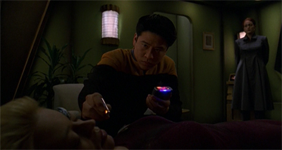 So Chakotay gets to be the centre of one more generic “phenomenon of the week” story in Shattered, a decision that feels like an extension of the use of his character in other generic “phenomenon of the week” stories like Waking Moments or Unforgettable or The Fight. Tuvok once again loses control of his mental faculties in Repression, the same character arc that he played in Meld and Riddles. In Nightingale, Harry Kim once again gets to emphasise his inexperience, a thread running through most Kim-centric episodes.