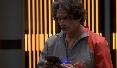 Joleg explains his situation to Neelix, insisting that he is a victim of racial prejudice. “It’s common knowledge that all Benkarans are criminals,” he states. “So when I was found in the vicinity of a murder, I was immediately arrested.” Neelix responds, “Are you saying you didn’t do it?” Joleg evades answering directly, instead warning his new friend, “I told you, I’m Benkaran. What I say doesn’t matter.” This observation is enough to spark Neelix’s interest, and the good-natured Talaxian takes it upon himself to investigate.