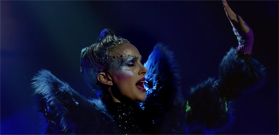 It is not for nothing that Celeste announces her emergence to the world with a pop song performance at a church. While some of Portman’s costuming inevitably evokes Black Swan, the film is positioning her more obviously as a dark angel. At one point, she refers to her fans as her “little angels.” At a press conference following a terror attack conducted using her own iconography, Celeste suggests that the terrorists might want to question their religious beliefs. “They can believe in me. Because I’m the new faith.”
