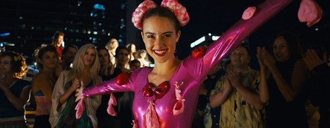 There are moments when Under the Silver Lake comes close to big ideas. At one point, Sam confronts a mysterious songwriter in his luxurious mansion. Playing his piano as he monologues, the figure muses, “There is no rebellion. There is only me earning a paycheck.” He boasts, “Your art, your writing, your culture, is the shell of other men’s ambitions. Ambitions beyond what you will ever understand.” Again, the scene is ridiculous on its face, heightened to the point of absurdity. Jeremy Bobb adds an uncanny quality to the sequence, buried as he is under pounds and pounds of make-up. However, there’s also an earnestness to the sequence, a sense of existential anxiety over the struggle between cynical commercialism and artistic endeavour.