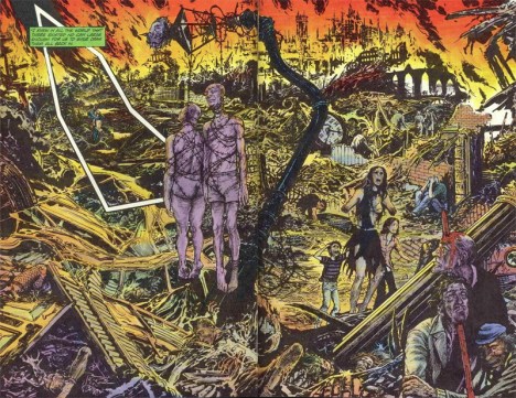 The sequences in which Tetsuo tears through Neo-Tokyo in Akira, leaving a trail of broken bodies in his wake, evokes the work of Alan Moore and artist John Totleben on the infamous Miracleman #15. In Miracleman #15, a wrathful and vengeful Kid Miracleman tears his way through London, leaving a trail of bodies in his wake. The artwork is graphic and brutal; Totleben’s defining work with Moore would come during his tenure on Swamp Thing, cementing the idea that Totleben is primarily a horror artist. Bodies are hung from trees, fires rage in the background like a cosmic inferno, the army is powerless to stop the atrocity as it unfolds. It is harrowing reading, even today.