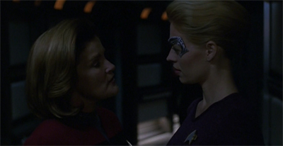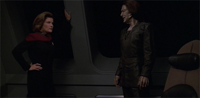 Janeway is back to preaching the virtues of the Federation to her senior staff. I guess it serves the plot this week. Who knows what her values will be next episode.