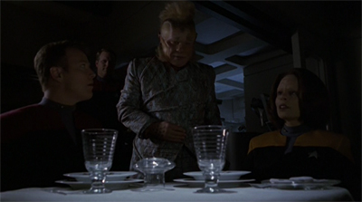 The Void is very consciously aware of this. It is telling that the teaser opens with four members of the senior staff being treated to a lavish and luxurious dinner. “Pinot noir, Commander?” Neelix asks at one point. Chakotay responds, “I’ll have another glass of the Chardonnay.” This is very much a typical day on Voyager, where the toughest choice that the crew have to make is between the Pinot noir and the Chardonnay. This is quite removed from life in the Delta Quadrant as revealed in Caretaker, where even clean water is considered a luxury item.