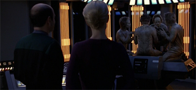 To a certain extent, this is to be lauded. However clumsily and narrowly, and however rooted in a very specific vision anchored in the franchise’s iconography, The Void is a story about the benefits of cooperation and collaboration. It rejects the politics of self-interest that have defined so many Voyager stories; the decision to trust oppressors over the oppressed in Alliances, the wariness about collectivism in Unity, the paranoia about refugees in Day of Honour. More than most Star Trek leads, Janeway could benefit from embracing cooperation and collaboration.