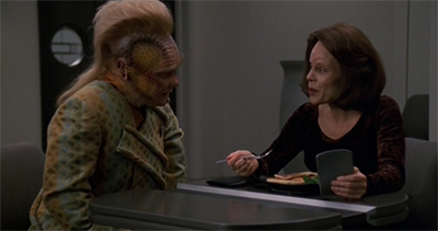 Quarra is not exactly home. In fact, it is another example of the many facsimiles and simulacra that populate Voyager. Reflecting the late nineties anxieties of the series, Voyager is consciously and repeatedly preoccupied with the question of what is real and what is not. It is the first Star Trek series to feature a hologram as a credited lead. On Voyager, reality seems to constantly warp and shatter; the EMH’s crisis of identity in Projections, Seven of Nine’s breakdown in Infinite Regress, Janeway’s romance with the a computer simulation in Fair Haven. Appearing in Voyager is to invite a crisis of identity, traveling backwards and forwards in time in episodes like Relativity or encountering alternate universe duplicates in Deadlock or even creating clones in Demon.