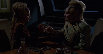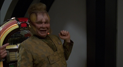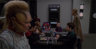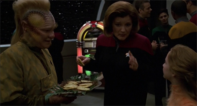 The celebration is steeped in fifties Americana; “cheese pirogues” are served as a jukebox belts out public domain takes on fifties rock ‘n’ roll music. The party is very much for the benefit of the human crew. “Great party, Neelix,” Paris toasts the host. Of course Paris appreciates the party; Paris’ fifties nostalgia in episodes like LifesignsBride of Chaotica! and even Repression echoes the series’ own embrace of fifties science-fiction aesthetics in episodes like Cathexis or In the Flesh.