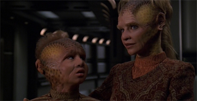 The addition of Haakonian occupation to Neelix’s backstory serves as retroactive motivation in Homestead. After all, Jetrel seemed to suggest that Neelix became a trader and a scavenger because he had no family left on Talax. Wars tend to create these dispossessed individuals, no matter what the outcome. However, Homestead suggests that there must be more it. Neelix’s departure from Talax had to be more than just a response to the horrors that he witnessed and the loss of everyone that he loved.