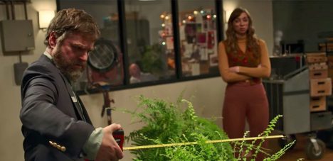 The Movie wraps a framing device around that set-up, expanding the world of its fictionalised Galifianakis by offering a broader context for the viral web interviews. In the world of the film, Galifianakis is a small-town public access television host whose work has been distributed online by a cocaine-addled Will Ferrell. Ferrell has exploited this “grotesque” as a twenty-first century freak show, which has become a runaway success according to the click counters that Ferrell keeps on his office wall or even carries around in his pocket at all times.