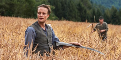 Indeed, the sequences where the real world intrudes into that farming community are effectively unsettling. Malick uses the weather remarkably well, clouds suffocating the mountaintops as things grow muddier. While the wide angle lens make the exteriors look beautiful, they have a distorting effect on close-up and interior shots. As the camera pushes in on the people around Jägerstätter, who fall increasingly under the sway of toxic ideology, their faces seem grotesque and warped and monstrous. Those spaces appear uncomfortable and alienating, contributing to the film’s mounting sense of dread.