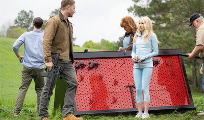 More than that, anybody who has ever seen a movie before would recognise that the set-up is an obvious red herring. There is no way that The Hunt begins and ends at that point, particularly given the involvement of director Craig Zobel and writer Damon Lindelof. Zobel is responsible for Compliance and several episodes of The Leftovers, while Lindelof was one of the architects of Lost. There was no way that the premise of The Hunt wasn’t going to twist and turn from that starting point, doubling back over itself and playing with expectations.