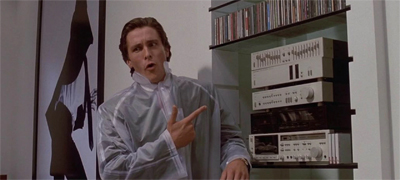 The film and the novel reiterate this in a number of ways. Most obviously, Bateman seems entirely incapable of independent thought. He is tasteless, but not because he has bad taste but because he has no taste. Bateman relies on a constant stream of sensory input to shape his awareness of the world. He is rarely seen without his walkman and his earphones, even during car rides with his fiancée. Even his fantasies of sex and violence are ported over wholesale from the porn and horror movies that he watches.