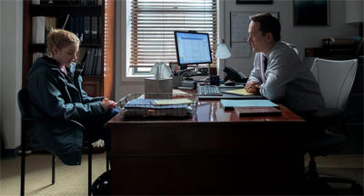 Green frequently offers the audience a snapshot of the character’s environment, if not himself. The camera is allowed inside his office only when he is absent. Green carefully and meticulous frames shots so as to reinforce the power that this executive holds over his company. While he is in a screening room, his office door is open, his desk clear and his chair empty. However, it centres the symmetrical frame. Jane’s desk outside his office is pushed to the right. She is minimised even by his absence, as much as he is ever truly absent.