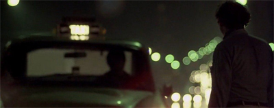 The opening sequence shoots the taxi cab itself like a monster. There are intense close-ups on the car as it moves through the urban night – tight shots on its headlights, glimpses through its windscreen wipers. The camera is often fixed on the cab itself as it drives down the streets, creating the optical illusion that the world itself is moving past Bickle. The car seems to emerge from and disappear into the steam rising from the city’s vents. The audience might be forgiven for wondering if it ever really existed at all.