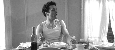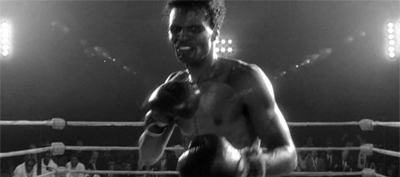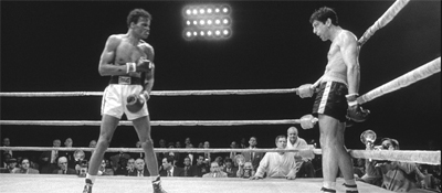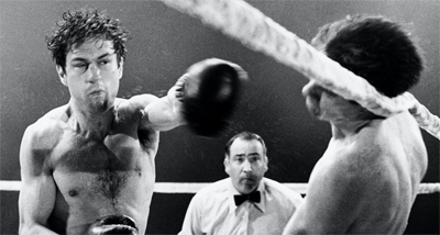 Most previous boxing films (an exception, Scorsese has noted, was Robert Rossen’s Body and Soul) kept the camera at a safe distance, outside the ropes; Raging Bull gets the audience right in the thick of it, with a seemingly endless arsenal of creative camera angles, positions, and movements that allow us to see each droplet of sweat and blood as it trickles down face and chest or sprays across the ring. The credit must go equally to Chapman (who, under Scorsese’s orders, had to adjust the frames per second in the camera—between 24, 48, and 120—during the filming of the fighting matches to create a heart-pounding start-stop effect), editor Thelma Schoonmaker, and sound effects editor Frank Warner for so remarkably pulling off this reinvention of boxing-film grammar. Together they create something far more tremendous than a simple “you are there” feeling—we feel like we are inside a stranger’s skull as it’s being beaten to a pulp, while at the same time we’re on the outside looking in, being handed an X-ray. The result is a strange form of empathy; we feel vulnerable (in other words, human).