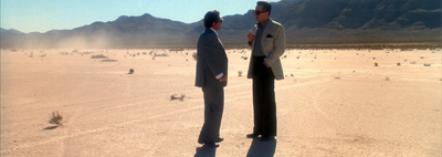 Casino leans heavily into the cinematic language of the western. This is most obvious at two points in the film. In the first of these, Nicky arranges to meet Sam “a hundred yards down the road” from the casino itself, which translates to the middle of the desert. Scorsese shoots a lot of the scene in wide shot, contrasting Sam’s stylish wardrobe with the wilderness around him. When Nicky comes roaring down the road towards him, the car kicking up dust behind it, it feels very much like a stand-off from the climax of a western.