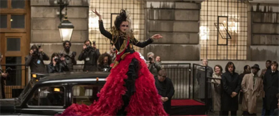 Understandably, this doesn’t exactly give Cruella a lot of hooks into a particularly compelling characterisation for the villain. So writers Dana Fox and Tony McNamara fall back on the standard building blocks of a story like this. As Cruella develops and explores its lead character, it becomes a loose assemblage of ideas and concepts drawn from better movies and assembled as clumsily as possible in an effort to extend a two-dimensional character into the facsimile of a three-dimensional human being.