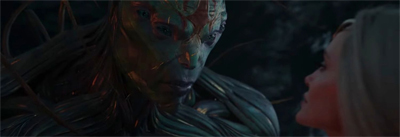 Indeed, it’s interesting to contrast Kirby’s very distinctive design of the Celestials with that used in the film. Kirby’s design is very sleek and smooth, all strong lines and clear curves. In contrast, Zhao makes a point to emphasise the tactility of these gigantic computer-generated entities. Arishem the Judge looks like he has been carved out of stone, his facade marked by blemishes and craters, as if his veneer has been scratched and cracked through millennial contemplating the cosmos. It’s not that one approach is better than the other, it’s that Zhao shoots this creature like it is part of this natural world.
