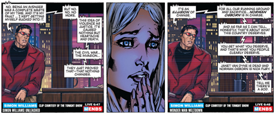 Clint is shocked at how the media makes itself complicit in Norman Osborn’s takeover of homeland security. “I thought the media would go after him,” he gasps, naïvely. “But they didn’t…” Simon Williams uses his guest appearance on a late night chat show to implicate the audience. “As far as I can tell, honestly, that’s about what this country deserves. You get what you deserve, and that’s what you people clearly deserve.” There is an awareness of the media’s building of consent and reality.