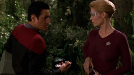 On its own terms, Human Error is a disappointment in a manner similar to a lot of late Voyager episodes. The premise is highly derivative of a number of relatively recent episodes. As with Imperfection, Seven of Nine experiences a technological malfunction that may kill her due to her Borg implants. As with Someone to Watch Over Me, Seven of Nine experiments with her humanity. As with Pathfinder (and much earlier Hollow Pursuits), a character finds themselves escaping from reality into holographic fantasy. As with Fair Haven, a lead character falls in love with a holographic partner.