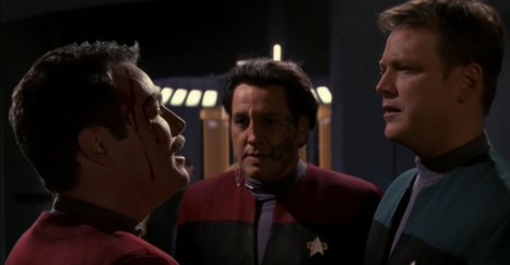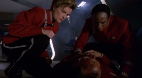 Voyager immediately fudged the answer to these questions. Parallax made it clear that the ship would operate just like the Enterprise. The Maquis would wear Starfleet uniforms, only distinguished by slightly different pips on the collar. Episodes like Learning Curve and Good Shepherd made it clear that there would be no attempt to adapt the chain of command to accommodate those who did not wish to conform. State of Flux made it clear that anybody who disagreed with Janeway’s approach would be very quickly removed from the ship.