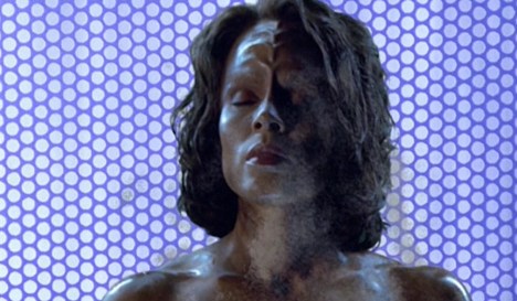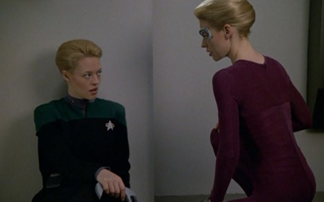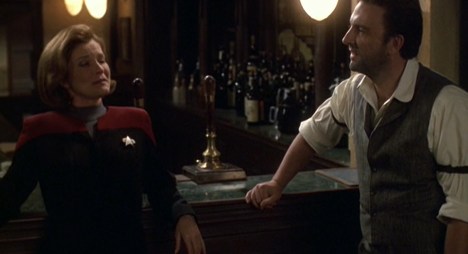 Voyager taps into nineties anxieties in a variety of other ways as well. The show was fascinated with questions about the nature of reality. The series was populated by simulacra and facsimiles; the silver blood replicas in Demon and Course: Oblivion, the con artists in Live Fast and Prosper, the actors in Muse. Characters often found themselves duplicated or combined, confronting replicas or replacements; Janeway faced versions of herself in both Deadlock and Endgame, multiple Sevens appeared in Relativity, Neelix and Tuvok were combined in Tuvix, Torres was split in Faces.