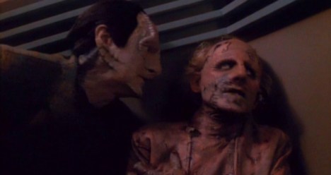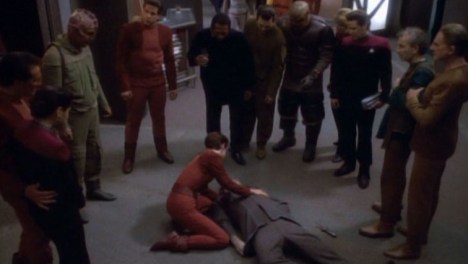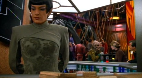 To be fair, the series did very little to distinguish itself in its earlier episodes. Many episodes of the first season feel like cast-offs from The Next Generation, familiar concepts reheated with a new cast in a new location. Babel was the stock “crew experience crazy contagion” episode in the style of The Naked Time or The Naked Now, while The Passenger was a body hijacking in the style of Return to Tomorrow or Power Play. Recurring characters popped up frequently, like the Duras Sisters in Past Prologue, Q in Q-Less, Lwaxanna Troi in The Forsaken.