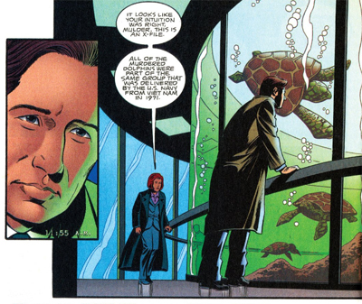 The comics themselves are actually surprisingly good. There is a reason that one of the first things that IDW did upon receiving the license was to publish “classic” collections of these comics. One of the more interesting aspects of the monthly series was the way that it managed to feel like The X-Files while still seeming suited to the medium in question. Stefan Petrucha and Charles Adlard pitched their run as something akin to a Vertigo comic, feeling like a crossover between The X-Files and the work of Grant Morrison or Neil Gaiman.